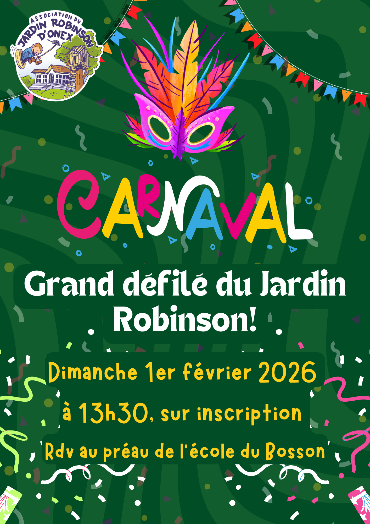Le dimanche 1er février, cortège du Jardin pour le grand Carnaval Onésien, pour les familles, 13h30/16h, sur inscription